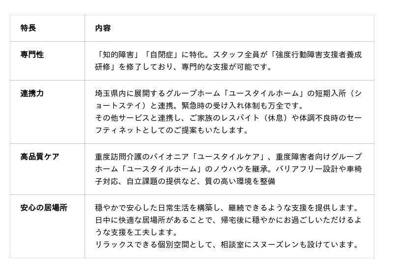 今回の「ユースタイルリビング 行田」を皮切りに、当社が運営する全国の日中サービス支援型グループホーム「ユースタイルホーム」や重度訪問介護事業所「ユースタイルケア重度訪問介護」との連携を深め、多機能な地域福祉拠点を順次拡大してまいります。