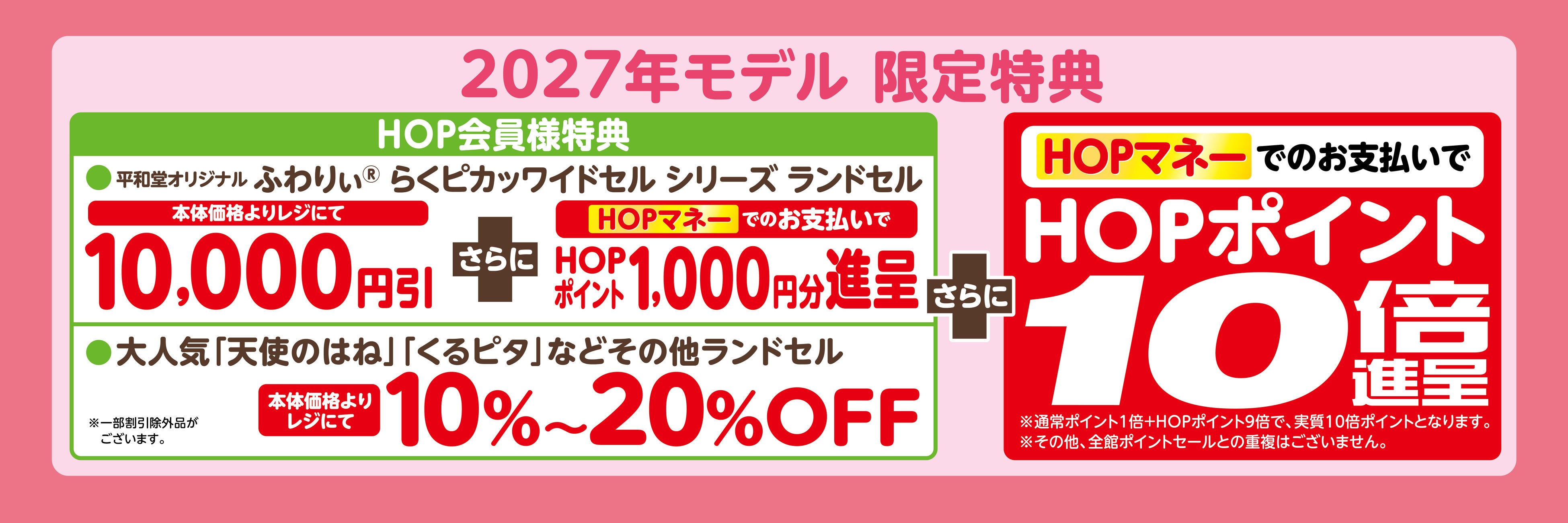 さらに平和堂オリジナルランドセル「ふわりぃ らくピカッ ワイドセル」ご購入で、1,000HOPポイント進呈