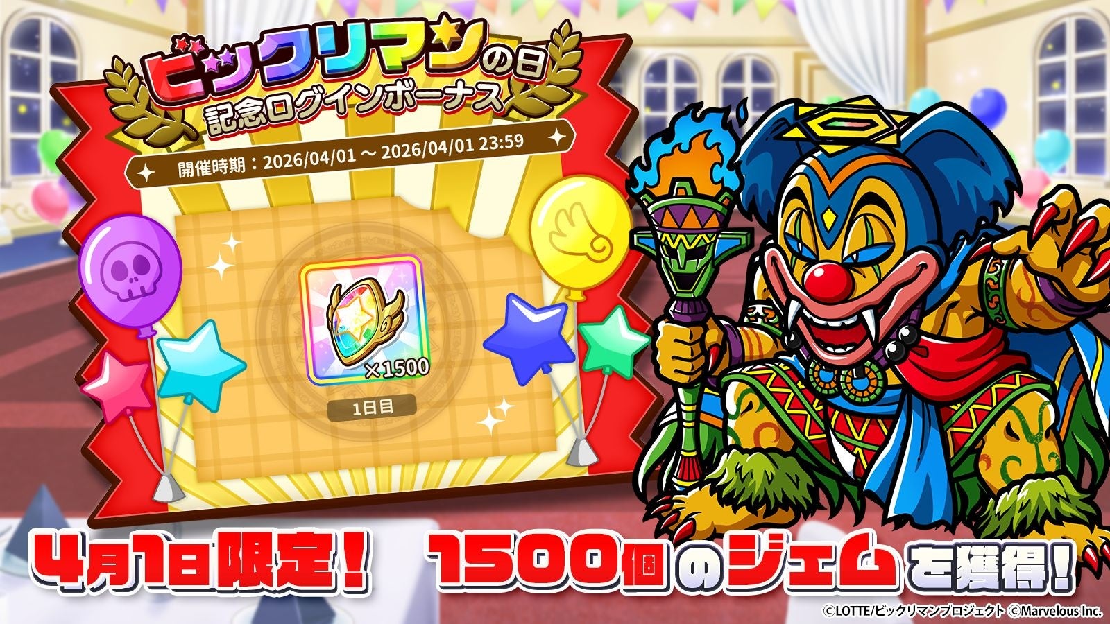 26年4月1日(水) 0:00~23:59の1日限定で、1,500ジェムを獲得できる「ビックリマンの日記念ログインボーナス」を開催いたします。