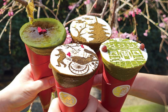 甘紋の香の和クレープは、天面に家紋や枯山水などの和モチーフがほうじ茶パウダーや抹茶パウダーで描かれており、抹茶と合わせて提供する茶菓子としても視覚・味覚の両面で高い満足度を提供できます。