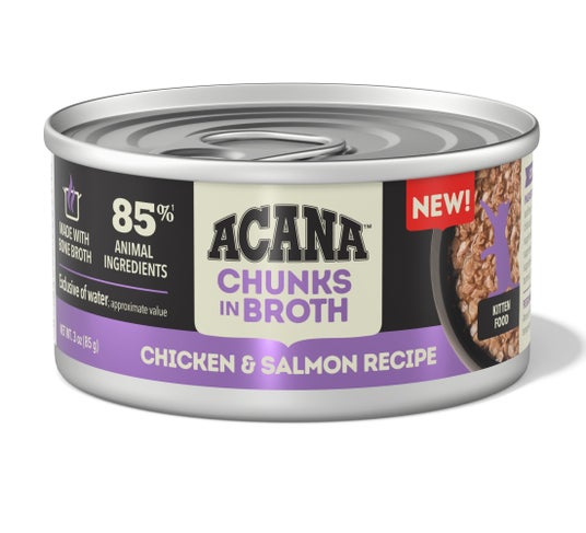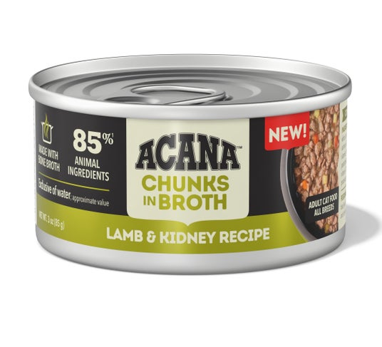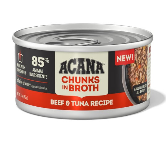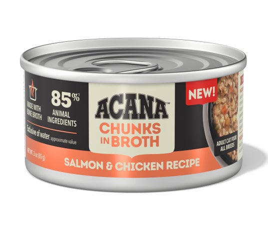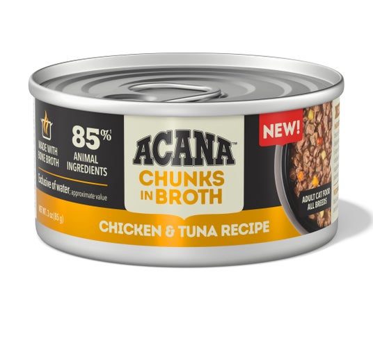 ACANAチャンク イン ブロスは、猫本来の肉食性に配慮し、動物性原材料を85%配合したウェットフードです。やわらかな肉の塊(チャンク)を、旨み豊かな丸ごとの骨スープで包み込んだ設計で、嗜好性と水分補給の両立を実現しました。
