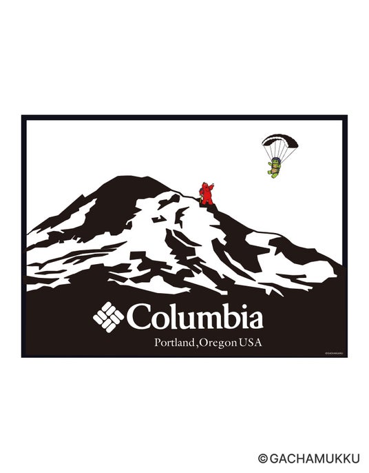 ガチャピン・ムックがあの有名なコロンビアのバックプリントでハイキングやパラシュートをして楽しむグラフィック。