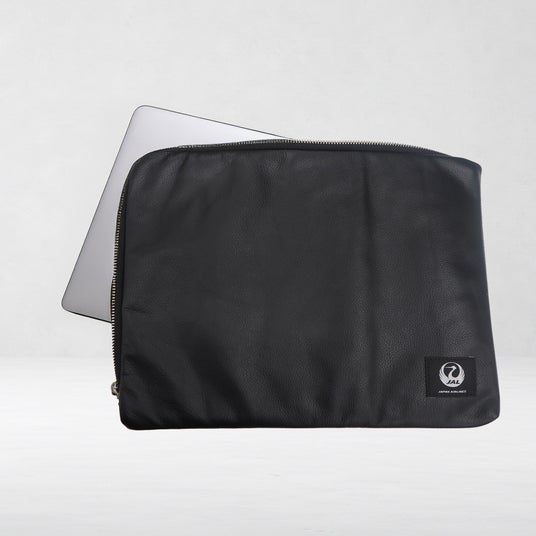 ボーイング 777型機の国内線エコノミークラスのシートレザーを再利用したノートパソコン用のケースです。素材はオーストリアで開発された航空機専用のレザーで、航空機の客室部品に求められる耐火性や強度があります。14インチまでのノートパソコンが収納可能です。