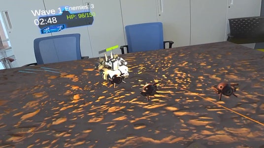 本作最大の特徴は、コントローラーを一切使わない「ハンドトラッキング」による操作です。左手で機体の前進・旋回、右手で攻撃を指示。自分の手が直接ゲーム世界に干渉する、MRならで直感的な操作感を提供します。