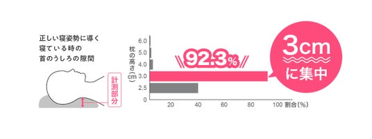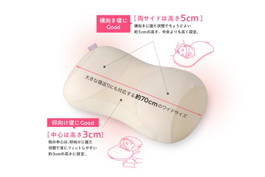枕のプロが過去の対面販売の測定データとこれまでのMARIOTTEの実績を徹底分析。そこで生まれたものが独自の「高さ理論」。この理論をもとに頭をのせたとき、中央部分は仰向け寝で安定しやすい高さ約3cm、サイドは横向き寝がしやすい高さ約5cmになるような枕設計にしました。様々な体格の人でも自然と背筋の伸びた美しい寝姿勢になります。