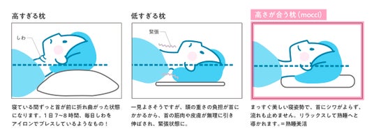 首や肩のこり、しわの原因は合わない枕の高さに原因があるといわれています。mocciの高さは、MARIOTTE独自の高さ理論をもとに設計されています。「フィットするヴィーナスチーク」と「高さ理論」を組み合わせることで睡眠中も美しい姿勢を保つことができます。
