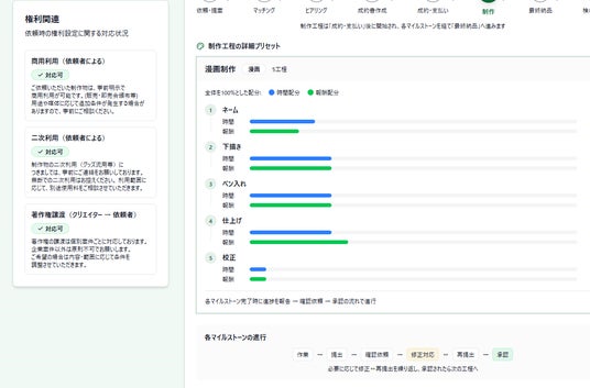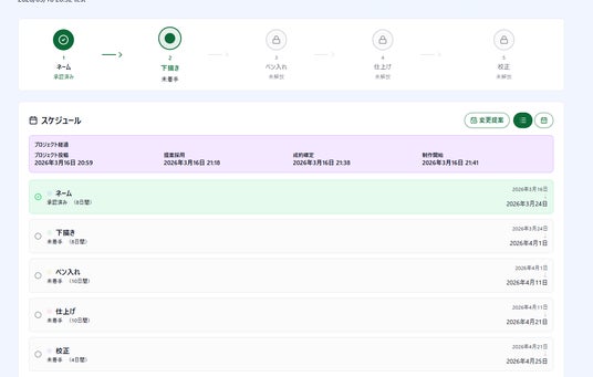 漫画制作における工程(ネーム・下書き・清書など)ごとに、進行と料金を管理可能。クリエイターごとに設定された工程・料金体系をベースに、スムーズな制作進行を実現します。
