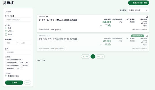 依頼者は掲示板を通じて案件を投稿し、クリエイターは応募・受注が可能。