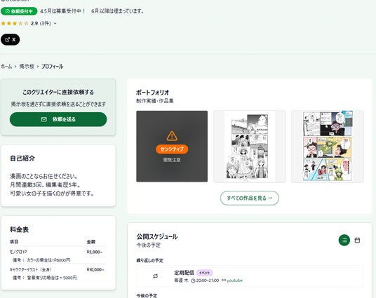 また、クリエイターのプロフィールページから、掲示板を介さない「直接依頼」にも対応しています。