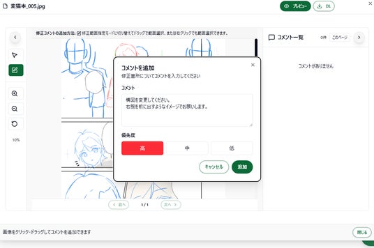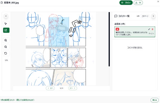 漫画制作で最も難しい「修正指示」を視覚的に伝達可能。制作現場で実用可能な形に最適化し、絵を描けない依頼者の方でも、チャット機能と組み合わせることで円滑なコミュニケーションを実現します。