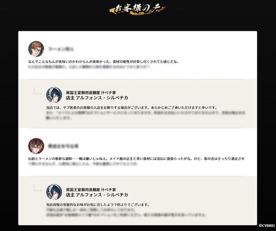 また、ラーメンを実食した、イケメンシリーズに登場する彼らによるレビュー「お客様の声」もご紹介。
