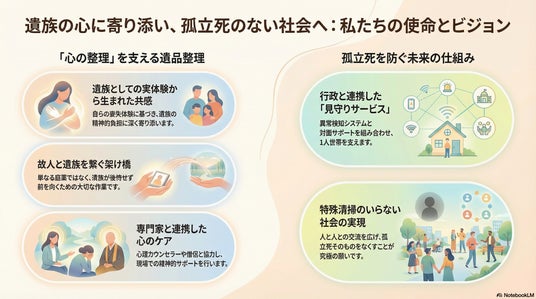 弊社では「物の整理を通じて心の整理をする」を経営理念としています。遺品整理・特殊清掃事業を通して死と向き合う中で私たちはのめざす夢は、