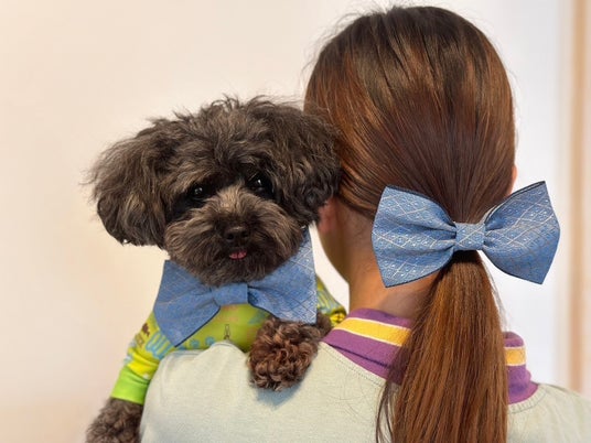 大切なペットの事を傷つけないように軽い木のビーズを使って調整できる蝶ネクタイとリボンモチーフのヘアゴムやヘアバンドをお揃いでつけられるようになっています。