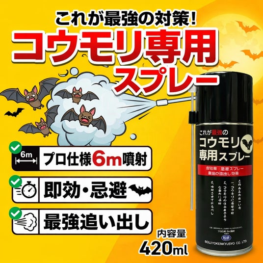 特徴・・・・・屋根裏や戸袋などに住みついたコウモリを天然植物成分の強力なハッカ臭で追い出すコウモリ専用スプレーです。