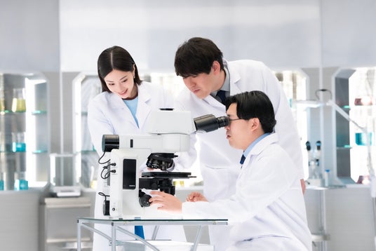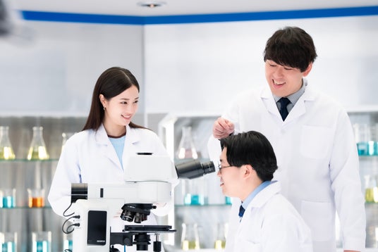 今回の素材はAGCの「ガラスコア」。ガラスに微細な穴をあけられるというが、果たして本当か。「小さな穴!?」と半信半疑の伊藤助手に、すず先生が実際に穴をあけたガラスを提示。では顕微鏡で確認しようということになり、覗き込んだ瞬間「オ~!めっちゃ穴あいてるっ!!」と大興奮。しかしその直後、畠中助手が伊藤助手の髪の毛を抜きます。毛髪の大きさと比較することで、穴の小ささを実感するという流れです。笑いの中にも「この技術は半導体の未来を支える」というすず先生の言葉が響き、AGCの素材力の深さを印象づけます。
