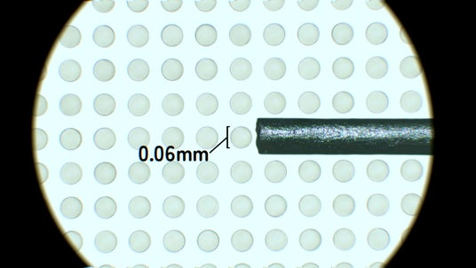 ガラスメーカーとしての技術力を活かし、薄い板ガラス基板に対して、微細な穴を狭い間隔であけることができます。