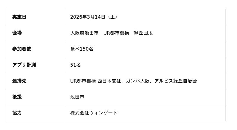 高齢化が進む団地・地域コミュニティで「逃げられない住民」が増えています。 株式会社ウィンゲート(代表:遠山健太)は2026年3月14日、大阪府池田市のUR緑丘団地で「減災体力測定」を実施。延べ150名の住民が参加し、70代以上の方々の平均スコアが最低水準であることが判明しました。体力データによる「要支援者の見える化」は、自治体の防災・介護予防施策を大きく変える可能性を持っています。