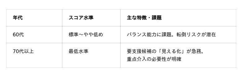 ※ 70代以上は平均スコアが全年代中最低水準。 要支援者の「見える化」と重点介入の必要性が数値で明確になりました。