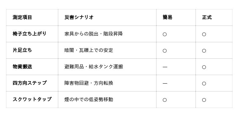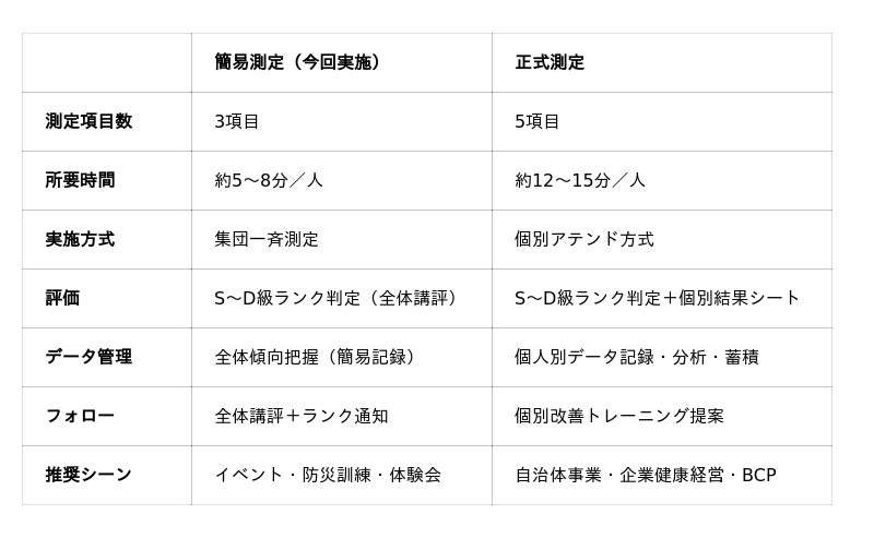 減災体力測定は「簡易測定」と「正式測定」の2タイプから選択可能です。今回の池田市イベントは集団で参加しやすい簡易測定で実施しました。