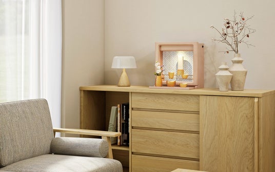 縁起物とされる松笠の文様が、祈りの空間をやさしく包み込むコンパクトなお仏壇です。上下スライド式のガラス扉は、閉じたままでも故人をいつもそばに感じられます。奥行きわずか17cmの薄型設計はチェストなどの家具に省スペースで設置できて、空間に圧迫感を与えません。明るい木の色がインテリアに溶け込んで、爽やかな祈りの空間を演出します。