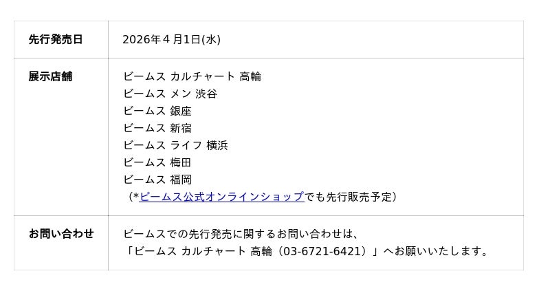 4月1日(水)から「ビームス カルチャート 高輪」を中心に下記店舗にて新商品を展示予定で、実際に手に取って体験いただけるコーナーをご用意いたします。