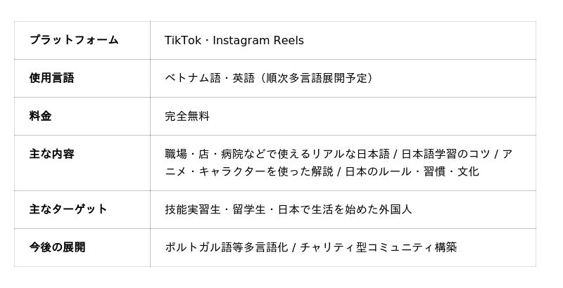 TikTok・Instagramを通じて、教科書には載りにくい「リアルな日本語表現」を30~60秒のショート動画で無償配信するこのプロジェクトは、サービス販売を目的としません。ただ、今日本にいる外国人が、日本での毎日をもう少し楽しく、もう少し安心して過ごせるように--そのためだけに動いています。