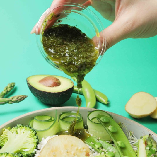 オリーブオイルのオレイン酸やハーブのポリフェノールが体の内側から整えてくれる身体に嬉しいポイントも魅力です。バジルの爽やかな香りで気分までリフレッシュできる、これからの季節にぴったりのドレッシングです。