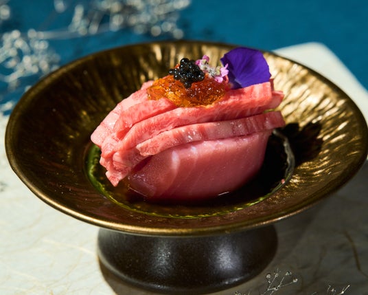 和牛の芳醇な甘みと本鮪の上品な旨みを掛け合わせた「本鮪和牛のユッケ」が新登場。華やかな盛り付けとともに、口の中でほどける贅沢な味わいをお楽しみいただける、牛の達人 浅草店ならではの一皿です。