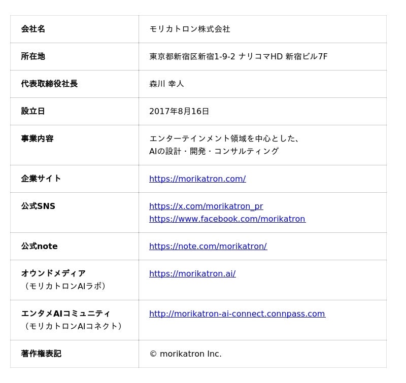 また、オウンドメディア「モリカトロンAIラボ」の運営や、自社主催イベント「モリカトロンAIコネクト」を通じて、エンタメAIの最新情報を共有し、業界全体の活性化に寄与する取り組みを推進しています。