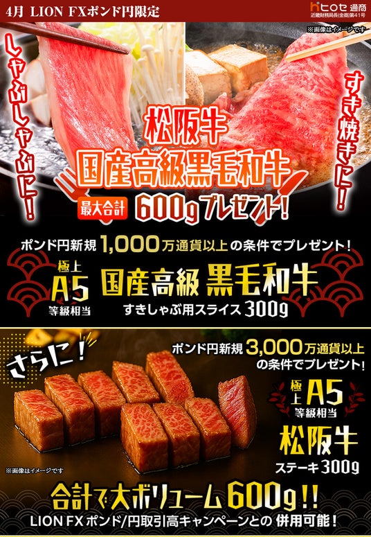 ヒロセ通商株式会社 (本社:大阪府西区、代表取締役:野市 裕作、以下:当社)は、当社の提供する「LION FX」において、2026年4月1日(水)より、「LION FXポンド円限定 松阪牛・国産高級黒毛和牛最大600gプレゼントキャンペーン」を実施することをお知らせいたします。