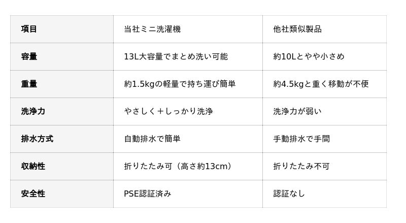 このような背景から、「大容量・省スペース・簡単・衛生的・持ち運び可能」といった特長を備えたコンパクト洗濯機への需要が拡大しています。