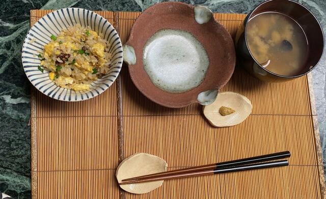 発酵ブイヨンを加えた卵炒飯、しじみの味噌汁。