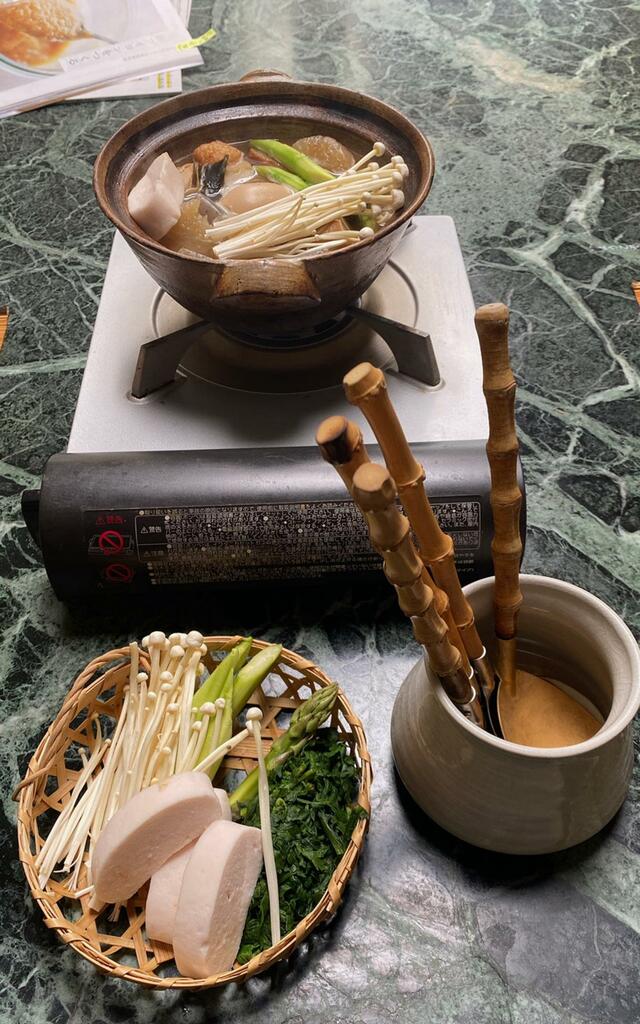 昨夜のおでんをもう一度。今朝はえのき茸とアスパラをプラスします。