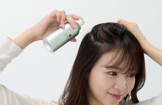 1.髪から15~20cmほど離し、髪を小分けにしながら頭皮・髪の根本に向け適量スプレーします。