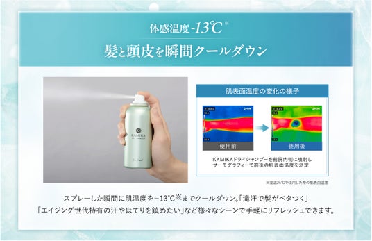 KAMIKAドライシャンプーは、年齢や環境の変化に左右されることなく、「心地よく過ごせる時間が少しでも長く続くように」という想いから、外出先でも手軽にリフレッシュできるアイテムとして開発されました。
