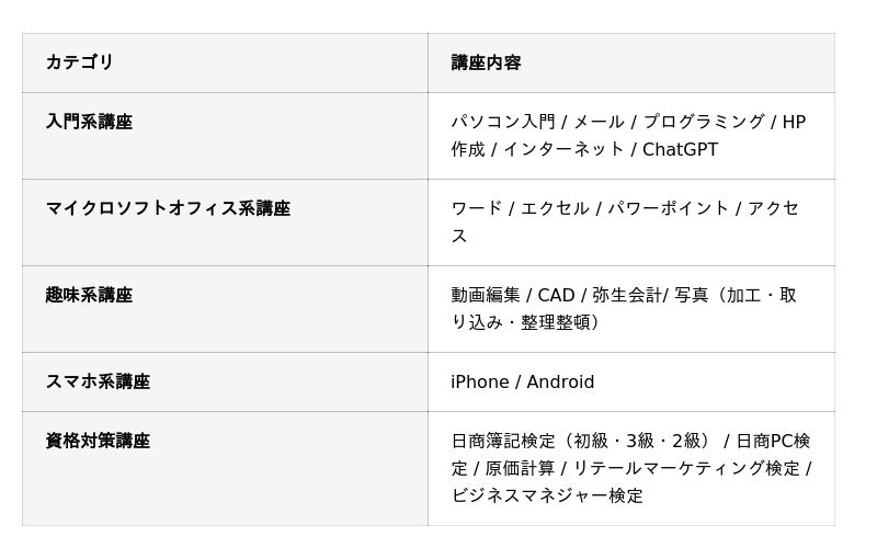 パソコン入門からワード・エクセル・パワーポイントなどのマイクロソフトオフィス系、iPhone・Androidなどのスマートフォン系、生成AI・SNSといった最新トレンド、さらに日商PC検定・簿記3級などの資格対策まで、約60種類の講座を開講しています。
