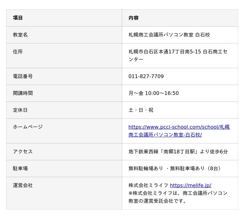 ・ホームページ:https://www.pcci-school.com/school/札幌商工会議所パソコン教室-白石校/