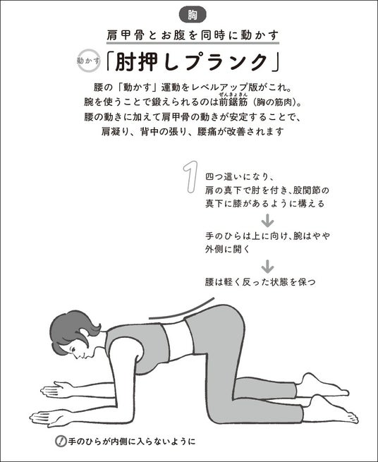 肩甲骨とお腹を同時に動かす「肘押しプランク」。