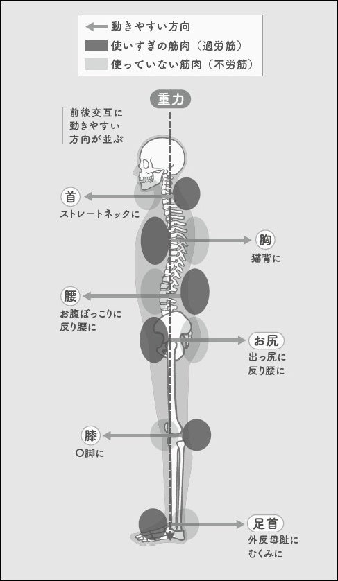ふだんの過ごし方が、「使いすぎの筋肉」「使えてない筋肉」という筋肉のバランスを崩していく。猫背、反り腰となり、体の痛みが引き起こされる。