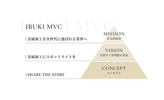 IBUKIのMVC世の中の多くの商品は、その裏側が語られることはありません。IBUKIは、商品とともに“STORY”を“SHARE”し、金属加工にスポットライトを当て続けます。その積み重ねにより、社会的認知と価値を高め、「金属加工を次の世代に選ばれる業界へ」という夢を現実に変えていきます。