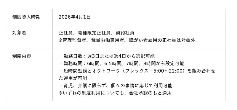 共働き世帯の増加やライフスタイルの多様化を背景に、勤務日数や勤務時間の制約によりキャリア継続が難しくなるケースも指摘されています。本制度により、働き方の制約によりキャリア継続が難しい状況にある人材の活躍機会を広げることで、労働参加の拡大や生産性向上といった社会的価値の創出につなげます。