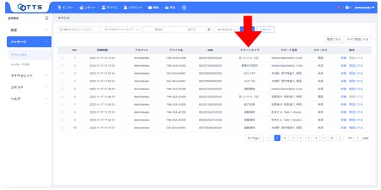 「TTSプラットフォーム画面」速度超過、振動、ジオフェンスの出入り、電源遮断などを検知し通知