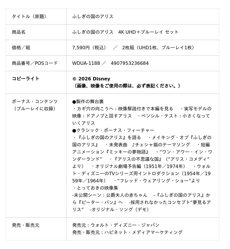 ウォルト・ディズニー・ジャパン株式会社(東京都港区)は、ディズニーを代表する名作アニメーション『ふしぎの国のアリス』の4K UHD+ブルーレイ セットを、2026年6月3日(水)に発売いたします!