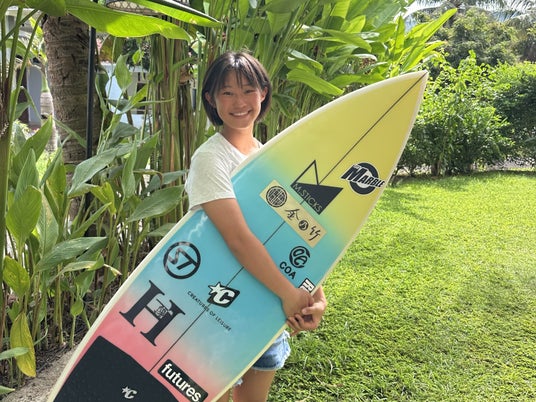 現在、13歳の宗政(むねまさ)ゆうみ選手。3歳で初めてサーフボードに立ち、小学1年生で「プロになる」と決意しました。