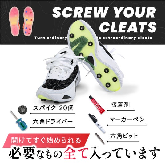 米国生まれのヤードキックスは、手持ちのスニーカーにスパイクを取り付け、野球やソフトボール用スパイクシューズにカスタマイズできるキット。専用スパイクを購入しなくても、履き慣れた一足や、お気に入りの一足が、そのまま活躍します。