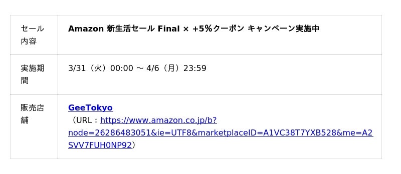 株式会社Gloture (本社:東京都港区、代表取締役:希咲 君一) が運営する自社Amazon店舗「GeeTokyo」は、Amazonにて開催される「Amazon新生活セールFinal」にて、2026年3月31日(火)00:00~4月6日(月)23:59までの7日間において、人気ガジェット製品を特別価格での販売いたします。
