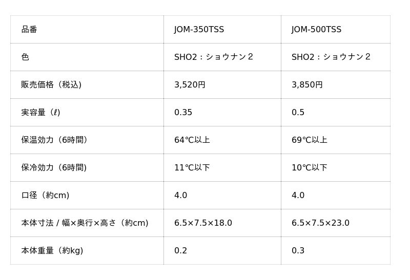 『真空断熱ケータイマグ(JOM-350TSS/500TSS SHO2)』 仕様一覧