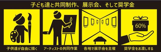 障がいのある子どもたちの原画をプロのアーティストが作品として形にし、展覧会で発表しています。作品の売上は、60%を描いた子ども・ご家庭への奨学金として還元しています。