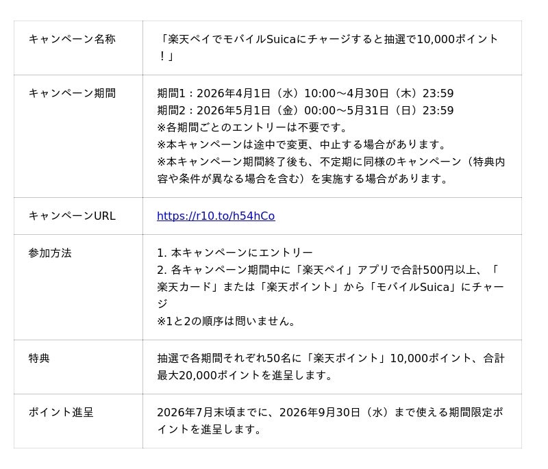 楽天ペイメント株式会社(以下「楽天ペイメント」)は、キャッシュレス決済サービス「楽天ペイ」アプリにおいて、抽選で最大20,000ポイントが当たる「モバイルSuica」チャージキャンペーンを、2026年4月1日(水)から5月31日(日)まで実施することをお知らせします。