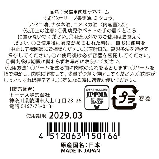本製品は、自然由来成分のみを使用し、「保護」と「保湿」を同時に叶える新しい肉球ケア習慣を提案するバームです。
